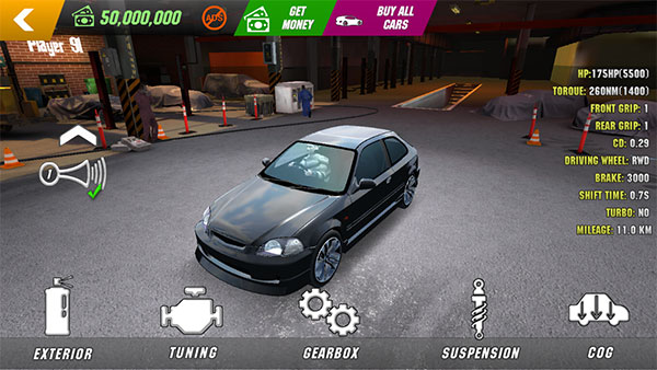 4、在游戏的设置区域,我们可以对我们的爱车进行改装,包括发动机,外观,扭力等,反正钱多,使劲造。