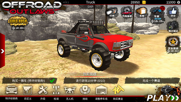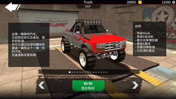 亡命越野(Offroad Outlaws)是一款玩法非常刺激的赛车竞速游戏。玩家们将在我们的游戏中模拟驾驶各种样式的游戏车辆,并展开刺激的挑战之旅。这款游戏主打越野自由驾驶的玩法,在游戏中玩家可以驾驶4种不同类型的越野车在地图上自由行驶,寻找地图上极具挑战性的赛事并参与进去,挑战最为极限的越野赛事!为您提供越野游戏所需的一切内容:完全自由的座驾DIY,丰富的越野地形,大量的挑战任务,以及多人游戏,以便您可以在巨大的世界地图上探索小朋友。您可以按照自己的方式创建一辆车。您可以完全控制底盘设置 - 刚度,阻尼,行程等......如果您需要,甚至可以更换为不同类型的悬架。对于车辆控制,您可以使用重力感应,箭头或屏幕上的方向盘控制。就如自定义座驾一样,控制方向也由你选择!