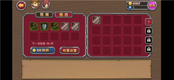 购买或出售装备:在商店中会随机出售一些装备,每通过一个关卡后也会奖励一件装备及一些金钱还有一笔少量的钻石。玩家可以在商店出售无用的装备,并购买需要的,个人感觉游戏中的金钱和钻石是很吃紧的,钻石获取难度太大,可能技能无法点亮。另外无法使用当前装备的角色头像会以红色背景显示。玩家也可以通过使用金币和钻石来刷新商店列表。游戏初期不推荐如此。