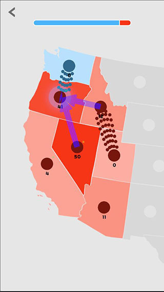 5、你还可以同时派遣多个地块的单位进行攻击扩张,具体操作方法是,点击拖动我方圆点至另一个我方圆点,最后再拖动至敌方地块,这样做可以有效的攻占敌方的地块。